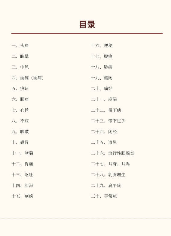 | 一 、头痛 二 、眩晕 三 、中风 四 、面瘫(面痛) 五 、痹证 六 、腰痛 七、心悸 八 、不寐 九 、咳嗽 十 、感 冒 十一、哮 喘 十二、胃 痛 十三、呕 吐 十四、泄 泻 十五、痢 疾 | 十六、便 秘 十七、腹痛 十八、胁 痛 十九、癃 闭 二十、痛 经 二十一、崩 漏 二十二、带下病 二十三、带下过少 二十四、闭 经 二十五、遗尿 二十六、流行性腮腺炎 二十七、耳聋、耳鸣 二十八、乳腺增生 二十九、扁平疣 三十、寻常疣 |